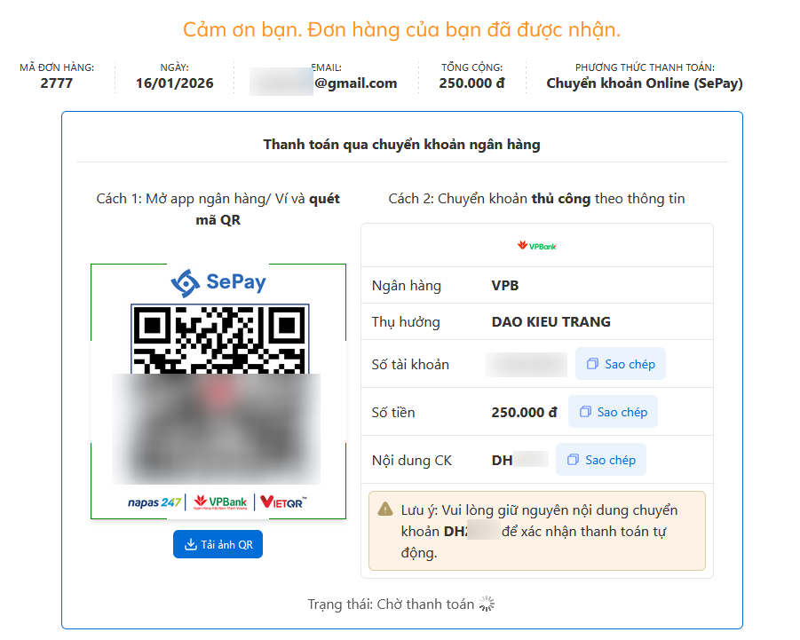 Bước 6: Nếu chọn “Thanh toán bằng mã QR” (Chuyển khoản Online) thì bạn hãy dùng App ngân hàng để quét mã và thanh toán. Sau khi thanh toán xong sẽ tự động xác nhận đơn hàng và gửi đơn hàng về mail của bạn. Nếu chọn “Thanh toán trực tiếp” thì hãy đợi nhân viên gọi điện xác nhận đơn hàng và hướng dẫn bước tiếp theo.